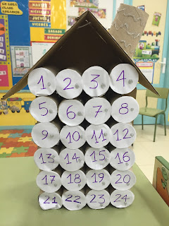 María, la mamá de Iván nos ha preparado un calendario de ADVIENTO en forma de casita con materiales de deshecho.